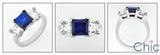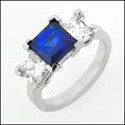 A attraCt ive three stone ring with a high polished solid shank and a high quality princess cut blue sapphire cubic zirconias center stone in V-prong setting along with princess cut diamond cubic zirconias in V-prong setting on the sides.