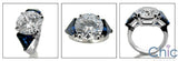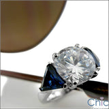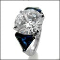 A modern three-stone ring with a high polished solid shank, high quality round cubic zirconia center,and sapphire color trillion cubic zirconias on each side.