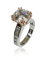 Magnificent Engagement Ring Showcasing a stunning 6 carat Rounded Cushion cut AAA high Quality, IGI certified Stone. The prongs are made in double wire style in Rose/Pink Gold. The shank is made in solid 14K white gold and is set with channel set princess cut stones. The width is 4.5mm for the shank.Wedding band item #5675B will be a perfect match for this engagement ring.