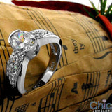 A gorgeous anniversary ring with high polished shank, with high quality oval cut cubic zirconia center stone set in half bezel setting, with high quality cubic zirconias on the sides in pave setting.
