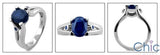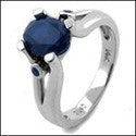 An elegant eye-appealing solitaire ring with high polished solid split shank, with oval cut sapphire blue high quality cubic zirconia center stone set in prong setting, and with round cut sapphire blue cubic zirconia stones set in bezel setting on the sides.