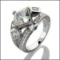 Fabulous anniversary ring has AAA quality princess cut stone set in prong setting on the center, split shank set with bezel set stones on it and sapphire color princess cuts from front and back view. The band also has pave set small round stones.