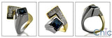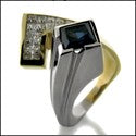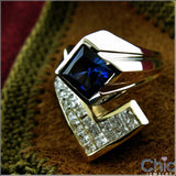 Unusual, two tone eye-catching ring with AAA high quality Sapphire color princess cut in bezel setting & AAA high quality princess cut stones in invisible setting. Heavy solid shank.