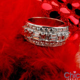 This elegant ring has 9mm wide band,set with baguettes and round high quality AAA cubic zirconia stones in prong and channel