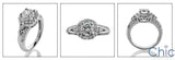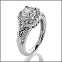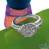 A 1.0 carat round AAA high quality cubic zirconia set in prong setting, surrounded by smaller pave set round stones.