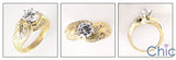 A combination of modern and classic look with a center stone in a six prong Tiffany style setting surrounded by round high quality round cubic zirconias in pave setting.