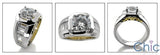 Elegant two tone anniversary ring with AAA high quality round center in prong setting. Graduate baguettes are set in channel on the sides.Yellow gold gallery underneath. 11mm in width.