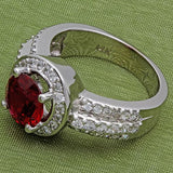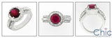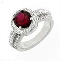 A stunning engagement ring with high polished solid shank and a high quality round ruby cubic zirconia center stone in prong setting and round diamond cubic zirconias in pave setting on the sides.