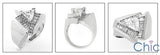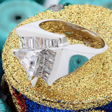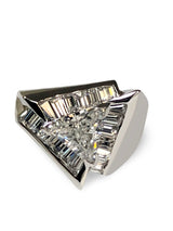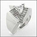 A unique design with a high quality triangle cubic zirconia set in a V prong in bezel setting and tapered baguette cubic zirconias set in channel on the side.