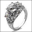 A fascinating three-stone anniversary ring of antique style and with engraved shank, with round cut AAA quality cubic zirconia center stone set in prong setting, and with round cut diamond color cubic zirconias set in prong and pave settings on the sides.
