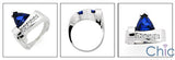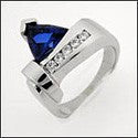 A unique high polished shank design with a high quality triangle sapphire colored cubic zirconia in V prong channel setting and round cut cubic zirconias in a channel setting on the side.