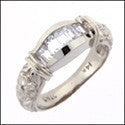 A magnificent ring with an engraved solid shank and high quality baguette shaped cubic zirconias in channel setting.