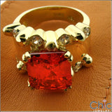 Out of ordinary ring set with AAA high quality fire orange color radiant stone in double wire prong setting, edges of the band are set with round stones in bezel setting heavy & wide, 14mm shank.
