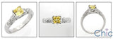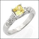 A modern anniversary ring with high polished solid shank and a canary color high quality cubic zirconia center stone in prong setting with round cubic zirconias on the sides in pave setting.