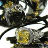 Two tone anniversary ring, set with 2.00 AAA high quality canary princess cut in yellow gold prongs, surrounded by small pave set round stones. Round stones in bezel, setting the band is covered half way with pave set stones.