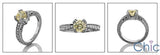 An enticing anniversary ring with a high polished engraved solid shank, with a light canary color round center stone set in prong, and round diamond color cubic zirconia set on the sides and prongs.