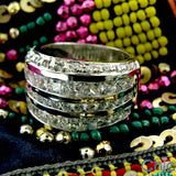 Breathtaking wedding anniversary band with high polished shank. 14.75mm wide. The band is topped with 3 rows of channel set AAA high quality round and princess cut stones, and pave set stones on the front and back view of the ring. Heavy solid shank.
