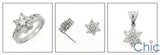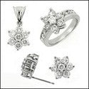 A flower design ring, pendant, and earring set with a high polished solid shank ring and high quality round cubic zirconias in prong and channel setting.