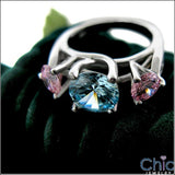Unusual 3 stone ring, set with AAA high quality 1.5 pink diamond color center stone in “V” shaped prong setting accompanied with 2 half carat blue dimond color round stones in 3 prong setting, shank has channel set stones on the sides