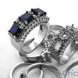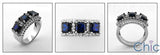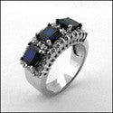 A beautiful anniversary ring a with high polished solid shank, three high quality princess cut blue sapphire cubic zirconia with round cubic zirconias on the sides in prong setting.