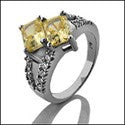 A beautiful engagement ring with a high polished solid shank, with gourgeous canary color radiant cut 1.0 carat cubic zirconias in prong settings. Shank is split with small pave stones on the sides.