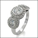 Dazzling three stone anniversary ring set with AAA high quality round stones in bezel setting, surrounded by small pave set round stones.