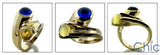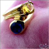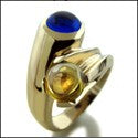Unusual right hand ring that can be used as an anniversary ring as well.Two AAA high quality sapphire & canary color round capushon cut stones in bezel and prong setting.