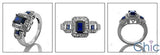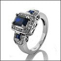 An admirable anniversary ring with a high polished solid shank, a high quality cubic zirconia sapphire color emerald cut center stones in prong, with small sapphire color princess cuts on the sides in channel, and small round stones in pave on the sides.