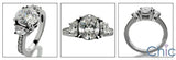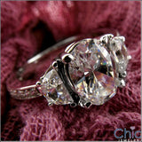 A stunning engagement ring with high polished solid shank, a AAA high quality oval cubic zirconia center stone with half moons on each side. The band has round pave set stones with filigree