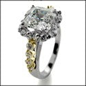 Unusual two-tone engagement ring set with 1.5 AAA high quality Asscher cut, surrounded with round stones in shared prong setting, shank has round stones in shared prongs on each side
