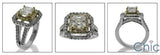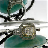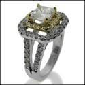 This trendy cz engagement ring is showcasing AAA high Quality IGI certified 1 carat cubic zirconia pricness cut center stone. The princess cut center stone is set in 4 prong setting in 14k yellow gold. The double two tone hallow is jeweled with round pave set smal cz stones. The shank has split style design and is set wity small pave set stones as well. The cubic zirconia engagment ring is made in two tone gold. The "14K" stamp is inscribed.