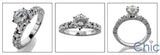 A superb engagement ring with a AAA high quality diamond cubic zirconia center stone in a Tiffany style six prong setting with round cubic zirconias in prong setting on the sides.
