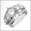 An elegant engagement ring with a high polished solid shank and a high quality round diamond cubic zirconia center stone in prong setting along with round, princess, and tapered baguette shaped diamond cubic zirconias in prong channel setting on the sides.