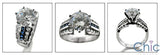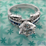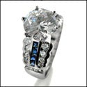 A dazzling engagement ring with high polish solid heavy shank, with round cut AAA quality cubic zirconia center stone set in 6 prong tiffany setting, and with combination of round and princess cut sapphire color high quality cubic zirconia stones set in channel and pave settings on the sides.