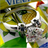 Modern ring with a high polished solid shank and a combination of a round AAA high quality cubic zirconia set in Tiffany and round cubic zirconias with sapphire colors on the sides in channel setting.