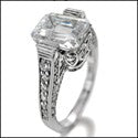 A beautiful elegant engagement ring with high polished solid shank, with Emerald cut AAA quality diamond color cubic zirconia center stone set in cannel and prong setting- with round cut high quality cubic zirconia stones set in pave setting on the sides that give this gorgeous ring the antique look