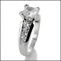 0.75 AAA high quality princess cut center stone set in “V” shaped prong setting- sides have a combination of round stones in channel setting.