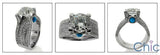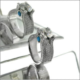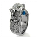 This beautiful 2.25 carat brilliant cut round cubic zirconia engagement ring is a show stopper. The 2.25 Ct center stone has AAA high quality and is IGI certified. The cubic zirconia engagement ring is showcasing 2 cabochon cut Turquoise stones in bezel setting in the front and the back view of the ring. The round center stone is set in 4 prong setting, that is topped with small pave set stones. The 8mm shank is jeweled with 175 round stones in hand set pave setting. The stones on the shank flow underneath the main stone, which creates a great amount of brilliance. The cz engagement ring is made in 14k solid white gold. "14K" stamp is inscribed. The 14k white gold has a Rhodium coating as well.