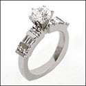 An exquisite ring with a round high quality cubic zirconia in six prong Tiffany style setting in the center and baguette cubic zirconias in channel setting on the sides.
