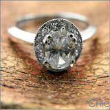 Gorgeous engagement ring set with AAA high quality oval stone in prong setting, surrounded by pave set stones. Solid shank.