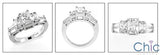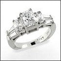 A stylish engagement ring with an radiant cut center stone set in prong and two more on the sides as well as tapered baguette cut cubic zirconias in channel settings on the sides.