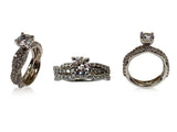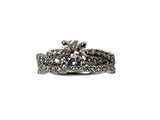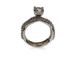 Elegant engagement ring with fitted matching band, with AAA highest quality, IGI certified round cubic zirconia 1 carat center stone. The round cz stone is set in 4 prong setting.The shank of the engagement ring has a eternity twist symbol style. The small stones are set in shared prong pave setting. Palm side of the ring has no stones.