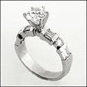 A fine engagement ring with a round high quality cubic zirconia in a six prong Tiffany style setting in the center with round and baguette cubic zirconias in channel setting on the sides.