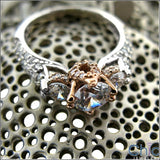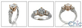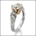 Elegant engagement ring, in two tone metal. The crown like prongs is made in Rose gold that holds AAA high quality round stone. Sides have smaller round stones immediately next to the center stone in prong setting. The crown like design as well as the sides of the shank are jeweled with small round stones in pave setting.