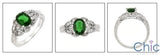 A elegant ring with engraved shank and high quality emerald oval cubic zirconia center set in prong with round diamond cubic zirconias in pave setting on the sides.