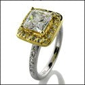 Antique looking elegant ring in two tone gold center has AAA high quality princess cut in prong setting surrounded by pave set round stones shank has rounded tube shape set again with small pave set stones.