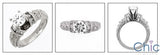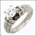 A solid shank engraved ring with a high quality cubic zirconia center stone in prong setting and round zirconias in channel setting on the sides.