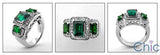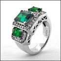 A beautiful anniversary ring a with high polished solid shank, three high quality princess cut emerald colored cubic zirconia with round cubic zirconias on the sides in pave setting.