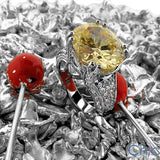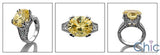 An impeccable anniversary ring with a high polished solid heavy shank, a 6.5 carat light canary color oval shape center cubic zirconia set in double prong, 1.5 carat total of round stones set in pave on the sides.