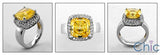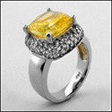 A distinCt ive engagement ring a with high polished solid shank, a high quality cushion cut canary cubic zirconia center stone with round cubic zirconias on the sides and on pave setting.